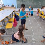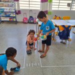 Quando os alunos perceberam as ruas e a intenção da professora logo se agitaram e muitos comentários empolgantes aconteceram, entregue um carro a cada criança e escolhidos os semáforos. Os alunos respeitaram os colegas no semáforo, agindo a cada cor apresentada, paravam no vermelho, seguiam no verde e mantinham a atenção indo devagar no amarelo; a atividade aconteceu tranquilamente e de tempos em tempos os semáforos eram trocados por novos voluntários.