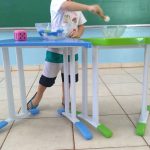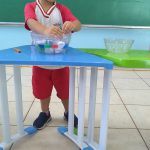 Em sala de aula, usamos duas bacias e colocamos os peixinhos de tampinhas de garrafas em uma delas, nossa varinha foi uma colher. Contamos uma história em que o rio estava sujo e precisamos salvar os peixinhos, então eles começaram a pegar de um rio que estava com a água suja e colocar no outro rio que estava com água limpa. As crianças realizaram a brincadeira em sala com muita alegria.