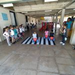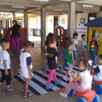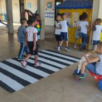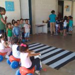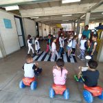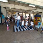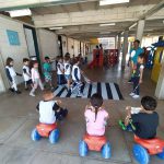 As professoras do 1º período confeccionaram uma faixa de pedestre e orientaram os alunos que ao transitarem pela rua deverão procurar a faixa para atravessarem, olhando sempre para os lados para verificarem se não vem carro. Algumas crianças andaram de velotrol enquanto outras atravessaram na faixa de pedestre.