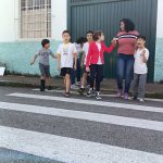 Conhecimento: levando os alunos para um uma prática de passeio nas ruas em torno da escola, ensinado a observar e ter atenção ao atravessar.