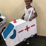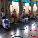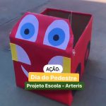 Obs: – A brincadeira consiste em dividir duas equipes por ano (1°, 2°, 3° e 4° ano). – As equipes deverão responder às perguntas feitas pelas professoras, que serão relacionadas ao trânsito e ao dia do pedestre. – Cada equipe terá 2 participantes que estarão caracterizados de carrinhos feitos com material reciclável, produzidos pelos próprios alunos. – O restante da equipe ficarão incumbidos de responder as perguntas. – A cada resposta assertiva, os carrinhos avançarão uma casa na pista. Caso a resposta esteja incorreta, os carrinhos permanecerão imóveis. – Vence o jogo, a equipe que o carrinho chegar no fim da pista primeiro. O fim da pista será representado um ponto de referência da Artéris.