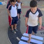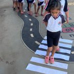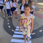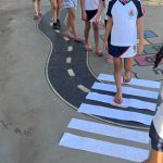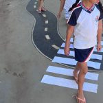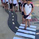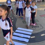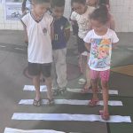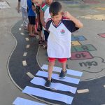 Atividades realizadas foram: roda de conversa sobre a conscientização de se atravessar na faixa, conhecer as cores do semáforo e seus significados, brincadeira simulando uma travessia na rua.