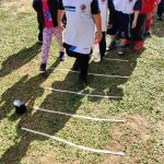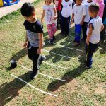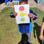 Após esse momento, seguimos para a área externa da escola, onde foi organizado um circuito lúdico no gramado, utilizando fita crepe para representar as faixas de pedestre e uma ilustração de semáforo. O aluno Anthony ficou encarregado de sinalizar o momento de atravessar com o semáforo, dizendo animado: