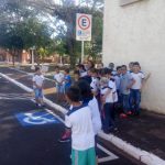 As crianças atravessaram a rua na faixa de pedestre e analisaram placas, tais como as que indicam vagas exclusivas para deficiente físico e idoso.