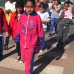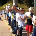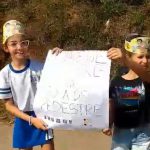 AS PROFESSORAS ATRAVESSARAM AS FAIXAS DE PEDESTRES COM SEU ALUNOS LEVANDO CARTAZES E FAIXAS, TAMBÉM CANTARAM UMA MÚSICA. OS ALUNOS USARAM VIZEIRA.