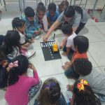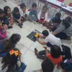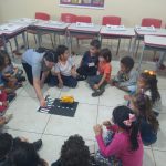 A professora Regina trabalhou com suas crianças as regras de trânsito para pedestres. Eles puderam fazer simulações utilizando tabuleiro com a faixa de pedestre e bonequinhos e carrinhos em miniaturas.