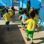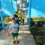 Em seguida as mesmas foram ficadas ao entorno da escola, e com um bambolê na cintura para representar o volante brincamos de dirigir respeitando as placas de trânsito trabalhadas .