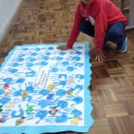 Após conversarmos sobre o tema, e o que aprendemos com ele, realizamos um cartaz, representando o mar/rio pintando as mãos com tinta guache azul e colando alguns peixinhos, simbolizando as formas de vida existentes na água.