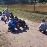 Os alunos viram peixes no lago e tinham gansos. E aproveitaram para brincar na areia que havia na estrada.