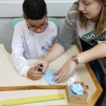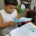 Em seguida, a professora pediu aos alunos que refletissem e listassem quais atitudes poderiam ser feitas para economizar água. Essas atitudes foram colocadas na lousa e cada aluno, utilizando o molde de uma gota riscou , recortou e escreveu uma dessas dicas.