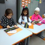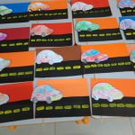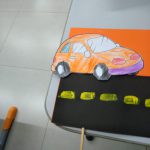 Nesta atividade, os alunos utilizaram um palito de sorvete, meia folha de filipinho preto, uma folha colorida, cola, guache e o desenho do carro.