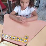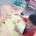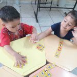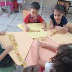 Após este primeiro contato, iniciamos o dominó das placas de trânsito, explicando as regras do jogo dominó e realizando as intervenções, relembrando e explicando sobre os sinais de trânsito presentes nas pecinhas de dominó.