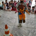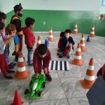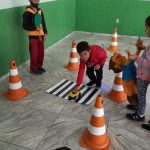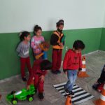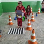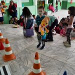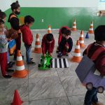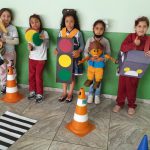 Nesta atividade levamos os alunos do 1ºano, 2º ano e fase I para o pátio e escolhemos alguns alunos para serem os pedestres, motoristas e o guarda de trânsito. Explicamos aos alunos que os pedestres precisam olhar para os dois lados antes de atravessar a rua e respeitar as sinalizações. Explicamos aos alunos que existe o semáforo de veículos e o de pedestre. Utilizamos alguns fantoches do Arteris da turma do Zé Quest para que os alunos ajudassem eles a atravessarem a rua com segurança.