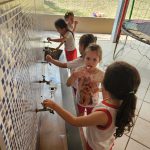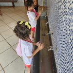 Desenvolvimento: Realizou-se uma roda de conversa onde foi mostrada uma imagem de um rio com água cristalina e com peixes e outra imagem de um lugar que era rio e que estava no momento seco e com entulhos. Após o levantamento das opiniões das diferenças entre as duas imagens, os alunos concluíram que não podem poluir e nem desperdiçar a água de casa, da escola e demais lugares; para evitar o que eles viram na imagem mostrada anteriormente (de rio seco e com entulho). Desta forma, os alunos tomaram consciência de não desperdiçar a água no momento de lavar as mãos e escovar os dentes na escolinha