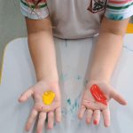 Passar um pingo de tinta primária em cada mão, misturar e ver qual a cor que formou. Carimbar no papel.