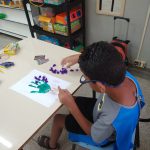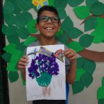 Na atividade o aluno fez uma árvore onde usou a própria mão com tinta guache, papel crepom e colagem de pássaros. E se divertiu bastante com a atividade.