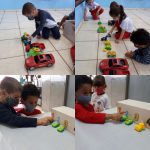 Avaliação: As crianças separaram os carrinhos por tamanho e depois pela cor. Quando deixados livres para explorarem sozinhos, houve divergências entre as crianças, mas no final deu tudo certo. Trabalhamos os numerais e sua quantidade. Depois de estacionar os carros, representamos a quantidade de carros de cada numeral representado.