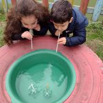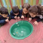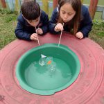 - Corrida dos barquinhos: A partir das atividades desenvolvidas a respeito do trânsito e meios de transporte, usamos material reciclável para confeccionar os barquinhos. No parque organizamos uma bacia com água e as crianças brincaram fazendo competição para ver quem conseguia soprar e conduzir o barquinho em alinhamento até o outro lado do rio (bacia).