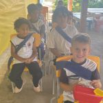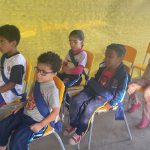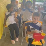 Atividades de vivências do transporte escolar com segurança, todos com cinto de segurança.