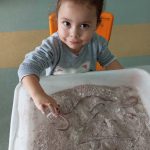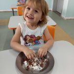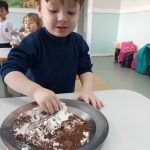 Utilizando farinha de trigo, cacau, café e azeite, vamos primeiramente criar uma terra comestível com as crianças.