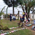 DESENVOLVIMENTO: Convidamos as crianças para ir ao parque procurar, explorar e recolher elementos naturais diversos como: folhas, flores, gravetos, pedras. Ao retornar para sala criamos á partir do que coletamos desenhos, usando a sua criatividade e ajuda das professoras.