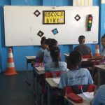 Usamos o modelo atual da auto escola. Primeiro tivemos aula terórica com a história de bicicleta, regras de uso no trânsito e manutenção da biclicleta. Após a aula teórica tivemos uma prova escrita com assuntos estudados e só após essa etapa passamos para prova prática onde o aluno Brayan aprendeu com a ajuda os outros alunos a andar na magrela.