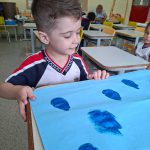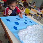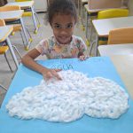 Para encerrar as atividades, as crianças desenvolveram um cartaz coletivo representando uma nuvem feita com colagem de algodão e confeccionaram gotinhas de água com esponja e tinta guache azul. A atividade estimulou a criatividade, a coordenação motora e a participação coletiva, reforçando a importância de cuidar da água.