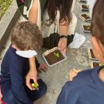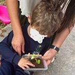 A atividade da turma se deu por vivência ao ar livre, onde os alunos realizaram o plantio de alface no potinho. A experiência requer que os alunos tenham autonomia para realizar a organização da terra no pote, plantar e regar.