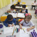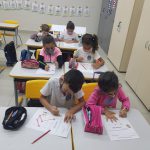 A partir da comanda feita pela professora, os alunos ligaram a estrada com as letras (vogais), utilizando uma das cores do semáforo. Os alunos realizaram a atividade satisfatoriamente, pois já identificam as vogais.