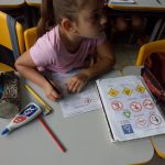 Em seguida distribuí folhas xerocadas com algumas placas e eles tinham que pintar e escrever o significados das placas, fizeram também outras atividades referentes ao tema abordado. Os alunos aprenderam a interpretar e identificar as mensagens da sinalização do trânsito e a compreender o que é trânsito e sua importância em nosso dia a dia.
