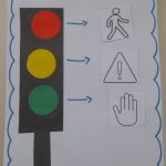Semáforos iluminados e prontos para funcionar partimos para a segunda parte da atividade. Cada criança recebeu três desenhos indiciando as ações que deveriam ser tomadas em cada cor indicativa apresentada pelo semáforo. Os desenhos foram os seguintes: uma mão indicando que o pedestre deveria parar; um ponto de exclamação indicando que seria preciso estar atento e; uma silhueta em movimento indicando que era possível atravessar a rua. Cada criança deveria observar as imagens e associá-las corretamente a cor que indicava essa ação, porém, lembrando que estávamos vendo o semáforo como pedestres caminhando pela rua.