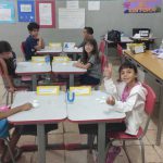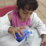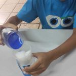 As crianças adicionaram água no algodão, observando como ele ficava cada vez mais encharcado e quando o algodão atingiu sua capacidade máxima de líquido, a água começava a pingar, representando a chuva.