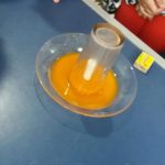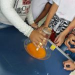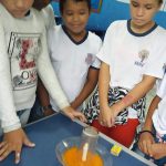 Em um pires, a professora fixou a vela de parafina e completou o espaço com água.