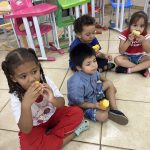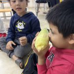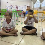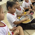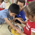 Após esses momentos de conversa, complementados por materiais, vídeos e fotos, passamos para uma atividade prática: a exploração e degustação do milho e suas variantes. As crianças puderam manusear o milho cozido e experimentar alguns de seus derivados, tornando o aprendizado ainda mais significativo e saboroso.