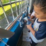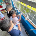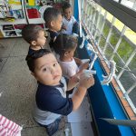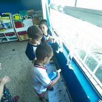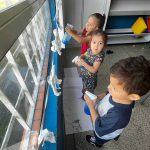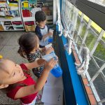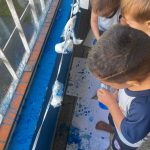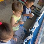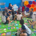As crianças borrifaram água com tinta azul na “nuvem” representa pelo algodão, para observar, as gotinhas de chuva caindo. Assim como cantado na música.