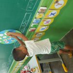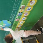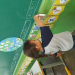 Em seguida, explico o que é a coleta seletiva e apresento as lixeiras, destacando que cada tipo de material deve ser descartado na lixeira correta. Depois, cada criança vai até o cartaz “Planeta Terra”, que está representado com vários lixos, escolhe um item e o coloca na lixeira correspondente, simbolizando o cuidado e a responsabilidade com o planeta.