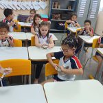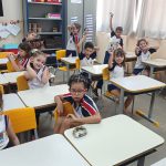 Depois da roda da conversa como o papai e mamãe dirige e onde as crianças devem ir sentadas dentro do carro, as crianças fizeram um volante com folha de revista, torcendo o papel e fazendo um círculo que foi utilizado em outras brincadeiras, a atividade além de trabalhar a coordenação motora ajuda a aprender sobre como os pais se comportam dirigindo o carro.