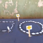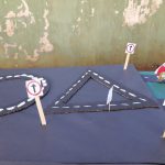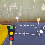 Depois propôs que as crianças desenhassem, pintassem e recortassem formas geométricas, formando pistas de carros, lembrando trevos, entroncamentos, rotatórias etc