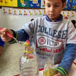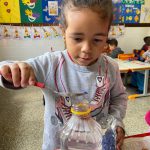A parte preparada anteriormente pela professora trata-se da mistura da água quente com gel, para criar o efeito que fará os elementos da garrafa terem movimentos mais lentos quando ela for agitada. Em sala, todas as crianças colocam glitter de sua preferência na garrafa com uma colher e ela é bem vedada pela professora, para segurança das crianças.