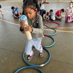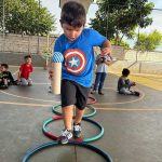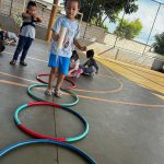 DURANTE A AULA DE EDUCAÇÃO FÍSICA OS ALUNOS PARTICIPARAM DE ATIVIDADES COMO O GRUDA BOLINHA E CIRCUITO, FEITAS COM MATERIAL RECICLADO, COM O OBJETIVO DE CHEGAR ATÉ O LOCAL DESEJADO.