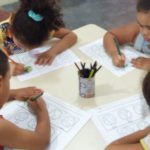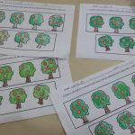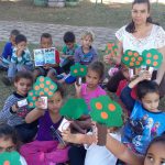 Em seguida, os professores prepararam uma atividade do bloco de atividades para representação de quantidade. Antes contextualizaram a atividade, confeccionando pés de laranja com rolinhos de papel higiênico para representar o tronco da árvore e quantidade e a copa com as frutas representando a quantidade. Em seguida retornaram para sala de aula e realizaram a atividade do bloco de atividades, estabelecendo relação com os pés de laranja e quantidades.