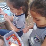Os alunos do 1º ano visitaram a horta da escola para observar como estavam os canteiros de tomate-cereja. Aproveitando a oportunidade, colocaram a mão na massa: colheram alguns frutos e os degustaram com muita animação.