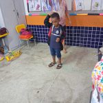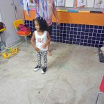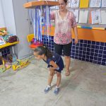 Utilizando papelão e papel crepom, a professora Luciana e a professora Vitória confeccionaram um lindo e divertido chuveiro para os alunos simularem tomando banho!