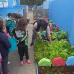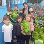 Saladassauro: Quando as plantas começaram a crescer, aproveitamos para convidar as crianças para colher e com auxílio das merendeiras preparamos uma salada simples com alface, cenoura e outros vegetais, onde exploramos a pré-história.