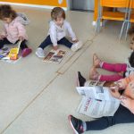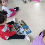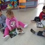 Organizamos as crianças em roda, e conforme o costume semanal, distribuímos revistas para a exploração. O direcionamento foi dado para que as crianças encontrassem imagens de animais (fauna). Em pequenos grupos, foram realizando a tarefa e, na medida em que os animais iam sendo encontrados, as crianças levavam a imagem até a professora que manipulava a tesoura (sem ponta) e que, por sua vez, recortava a figura, destacando-a do contexto e abordava os aspectos do animal em questão:
