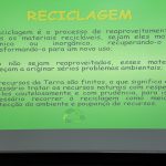 A atividade teve como objetivo principal levar os alunos a refletir sobre a importância de se reciclar. A reciclagem além de preservar o meio ambiente, gera riquezas e empregos onde diversas famílias sobreviveram da catação de lixo. A reciclagem desses materiais contribui para a diminuição significativa da poluição do solo, da água e do ar. Foi feita uma apresentação em PowerPoint na lousa digital da sala de aula com slides sobre o assunto, onde foi sendo apresentado e discutido com os alunos o assunto.