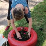 Na escola tinha alguns pneus que seriam descartados, os alunos pintaram os pneus e junto com as professoras plantaram diversas flores.