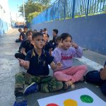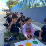 Sob o comando da oficineira responsável, os alunos prestavam atenção ao comando recebido e, de maneira coordenada, realizavam o gesto de bater na cor correspondente do semáforo indicado o quanto antes. Essa atividade visava promover o entendimento e a prática de sinais de trânsito de forma lúdica e educativa, garantindo que os alunos assimilassem as orientações de maneira clara e eficiente.