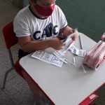Os alunos recortaram pares de figuras com palavras e ilustrações sobre agentes de trânsito (ciclista, motorista e pedestre) e elementos de sinalização (faixa de pedestres, semáforo, placas). A partir desse jogo da memória do trânsito relembraram conceitos importantes estudados estimulando a alfabetização associando as imagens a representação escrita, a habilidade de atenção e principalmente de memória. As peças recortadas pelos alunos foram embaladas pela professora e eles levaram para casa para se divertir com a família e aprender de forma lúdica.