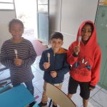 - Produção dos semáforos: os alunos pintaram um pequeno semáforo com as três cores (vermelho, amarelo e verde), recortaram e colaram no palito de sorvete.